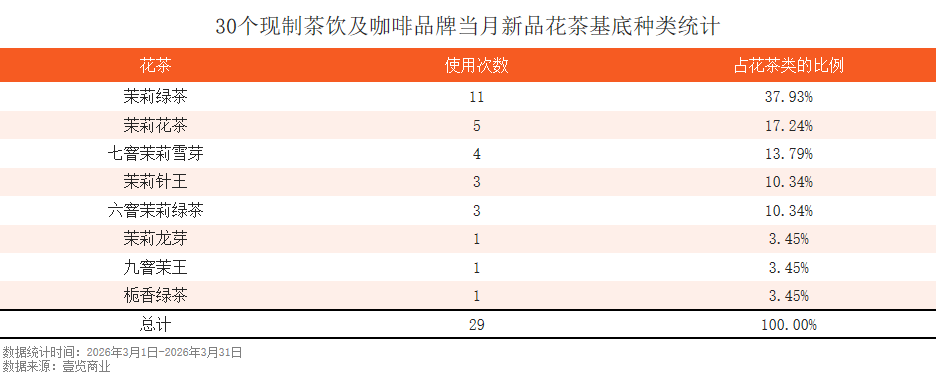从茶基底类型看,花茶类以29次居首,占比42.6%;绿茶类26次紧随其后,占比38.24%;乌龙茶类8次,占比11.76%;红茶类5次,占比7.35%。花茶与绿茶合计占比80.89%,成为本月茶饮创新的绝对主导茶底。