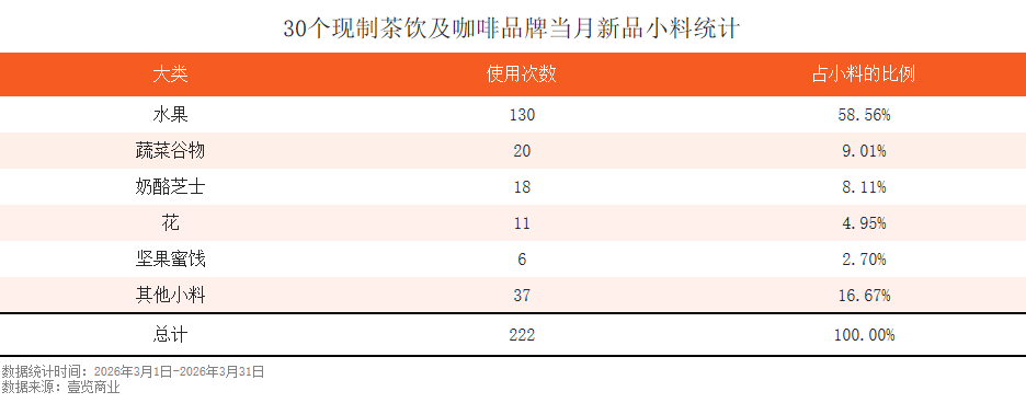 从大类分布看,水果类小料以130次应用、占比58.56%,成为风味构建的绝对基石。